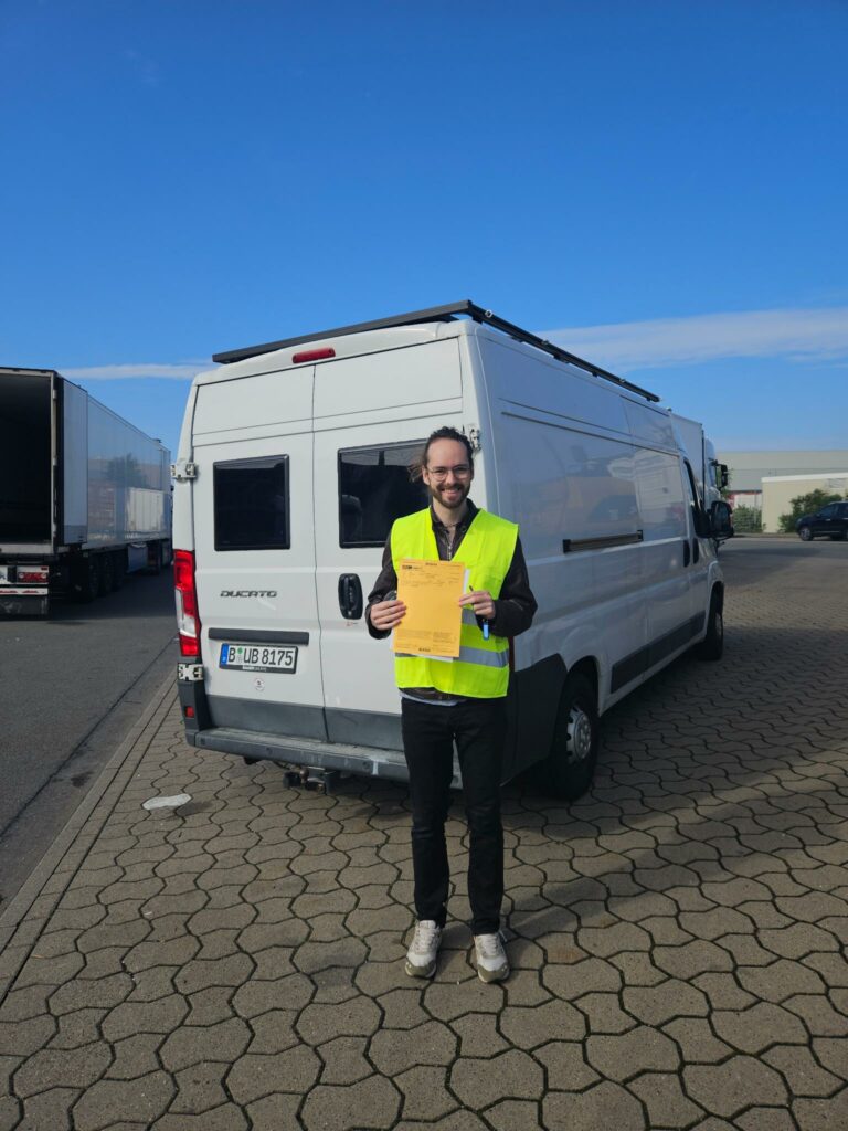 Am nächsten Morgen geht es ab zum Hamburger Hafen. Die Papiere für die Abgabe sind schnell geholt. Wir bekommen eine Scheibe mit, die uns durch Vibration anzeigt, wann der Bub auf das Hafengelände gefahren werden kann. Und jetzt heißt es erstmal warten. Die Spannung und die Ungewissheit ob alles reibungslos funktionieren und unser Bub sicher nach Halifax gebracht wird steigt. Dann geht’s los – die Scheibe vibriert und Silas steigt mit Warnweste und Papieren ausgerüstet in den Bub und fährt los. Da nur eine Person den Camper auf das Gelände fahren darf, bleibt Shirin draußen allein zurück. Silas und der Bub sind weg und die Emotionen überschlagen sich. Nach ein paar Minuten kommt Silas zurück und jetzt heißt es erstmal warten bis wir den Bub in ca. 2-3 Wochen in Halifax wieder in Empfang nehmen können.